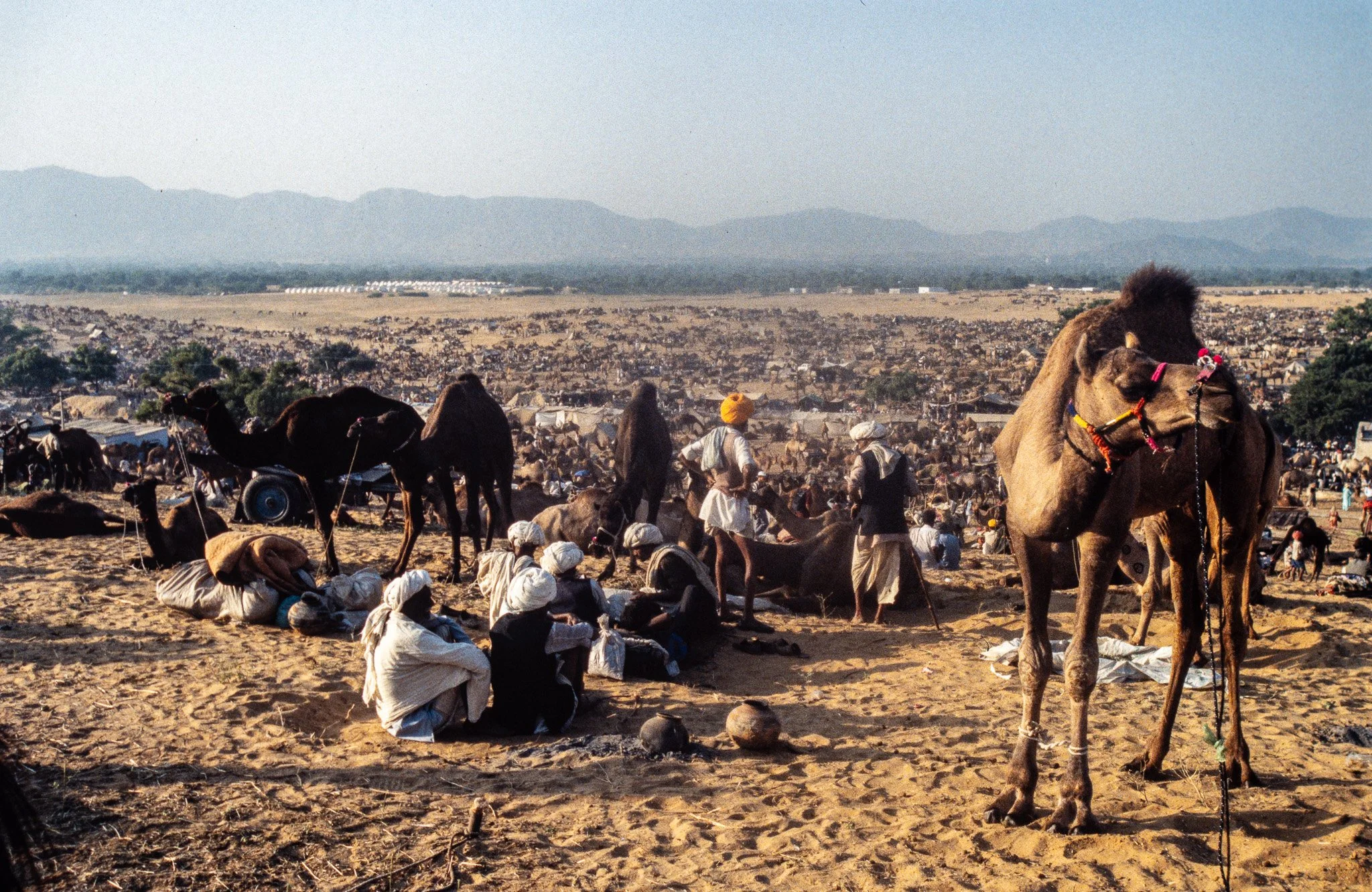 After lunch, we went to the fair, which our Brahmin guide had told us wouldn’t be really busy for another three days. The scene was almost biblical. Camels, cattle, and their owners stretched as far as the eye could see. Every time we reached the brow of a hill, there were yet more camels and camel carts, with groups of nomads sitting and chatting in the dust.